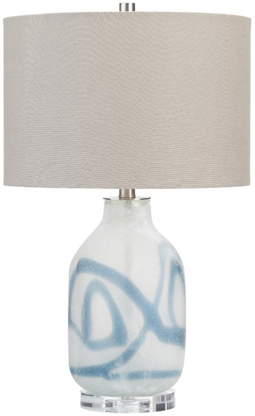 A stunning blend of artistry and elegance, this glass table lamp showcases soft ocean-inspired swirls over a subtly textured surface. The clear crystal base adds a hint of sparkle, grounding the look with sophistication. Finished with a classic linen drum shade, this transitional piece brightens side tables and consoles.Read More