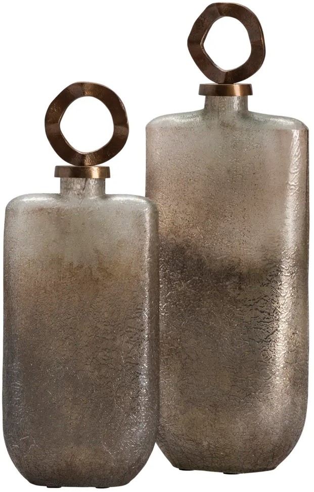 The Crestview Collection Valentina Covered Vases are made from textured glass and have a natural earth tone, graduated stone look going from dark gray to gold and then to light gray as you move up the bottle.Read More