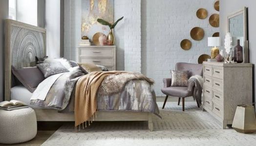 Elevate your luxurious home with the Belmar king panel bed, dresser, mirror, and chest. Crafted of rubberwood solids and split heart oak veneers, this kit features a washed taupe and silver champagne finish, full extension drawers with premium felt lined top drawers and cedar lined bottom drawers.Read More
