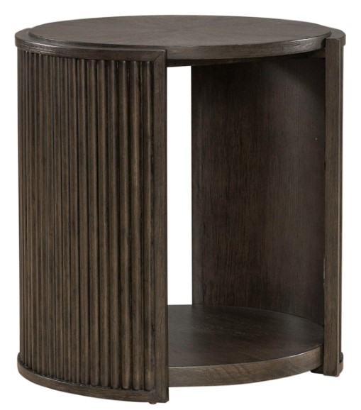 At its core, the round end table features softly curved reeded end panels, adding a touch of elegance and refinement to its aesthetic. These subtle details lend a sense of texture and depth to the table, creating visual interest without overwhelming the space. An open bottom shelf provides ample space for storage and display, allowing you to showcase your favorite books, decorative items, or personal treasures with ease. Whether you're organizing magazines, displaying a potted plant, or storing remote controls, this shelf offers endless possibilities for customization and personalization. With its compact size and versatile design, the City View round end table is the perfect companion for any seating arrangement. Whether placed next to a sofa, armchair, or even in a corner as a standalone accent piece, it adds both style and functionality to any room.