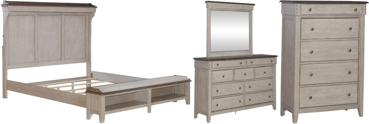Create a relaxing retreat with the Ivy Hollow king mantle storage bed, dresser, mirror, and chest. Crafted of poplar solids with pine and alder veneers, this kit features a heavily distressed weathered linen finish with saw marks and dusty taupe tops, full extension drawers with premium felt lined top and cedar lined bottom drawers, offset top drawers to create dimension, framed end panels, pin nail head accents, and antique pewter knob hardware.Read More