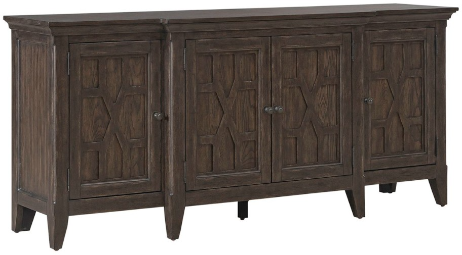 Make your home impressive with the Paradise Valley 76" TV console. Crafted with rubberwood solids and split heart white oak veneers, this piece features a saddle brown finish. There are four wood framed doors with beautiful Chippendale fretwork overlays that are accented with antique pewter knob hardware.Read More