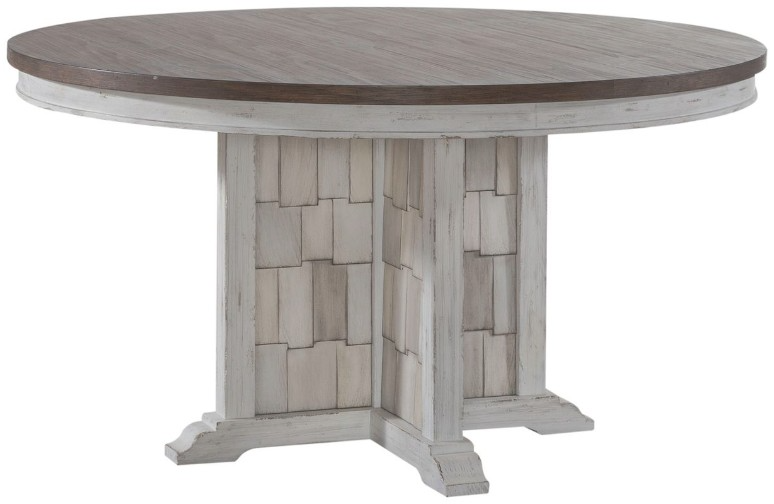 Designed to entice a sense of calm and tranquility into interior spaces, the River Place pedestal table strikes the perfect balance of life on the coast and a comfy home tucked away in the hills. Crafted with pine solids and veneers, this table features a heavily distressed riverstone white and tobacco finish.Read More