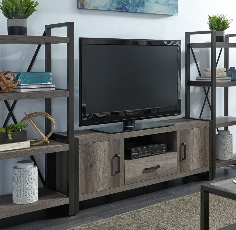 Tanners Creek Entertainment Center with Piers is sure to bring the whole family together. This entertainment center is scratch resistant, thanks to the use of melamine. 63" tv console features an open compartment for components and two center drawers that are flanked by two doors, accented with a dark pewter metal finish.Read More