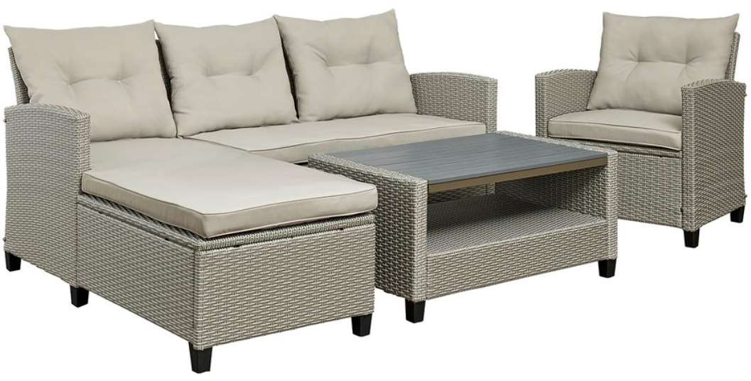 Set includes left arm lounger, cocktail table, right arm loveseat and chair.