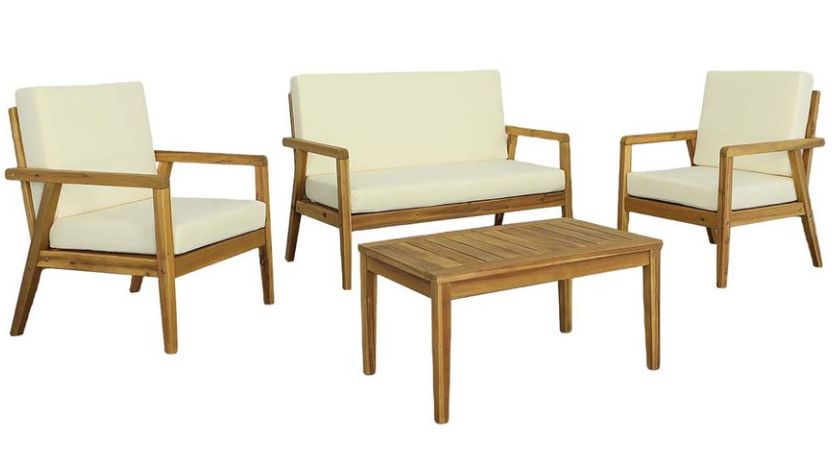 Relax in style. This outdoor group with loveseat, 2 chairs, and a cocktail table will not disappoint. A great transitional style that will go with any setting. The Natural acacia finish is smart and easy. The wood cocktail table is perfect for your morning coffee or afternoon cocktails.Read More