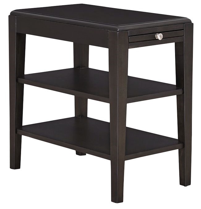 A chairside table in an espresso finish. A smart classic style perfect with so many styles. A simple transitional design with a little pull-out tray and 2 full shelves for storage or display. This table not only looks sharp but is also multi-functional including 2 electrical outlets with 2 USB ports.Read More